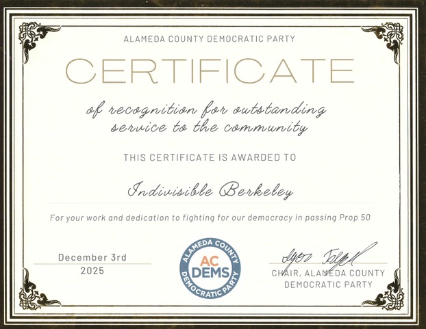 We’re grateful and proud of the recognition from the Alameda County Democratic Party for our work in canvassing for Prop 50!